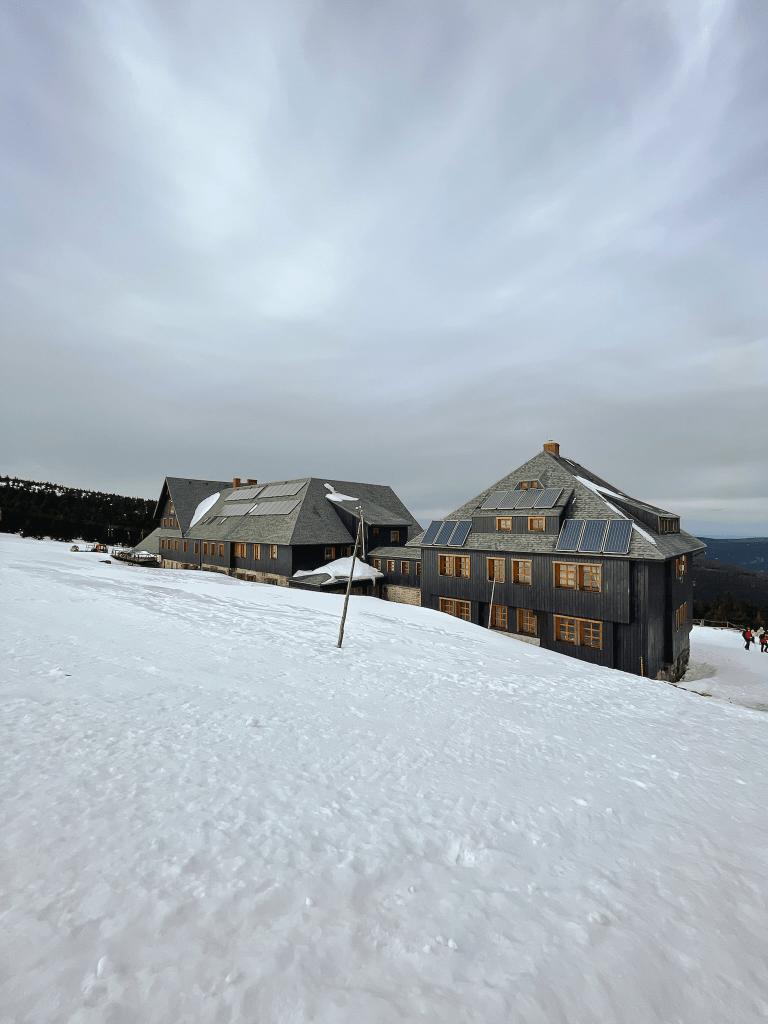 Choć nie jest to duże schronisko PTTK, zdecydowanie warto tu zajrzeć. Pierwotnie funkcjonowało jako buda pasterska, z czasem jednak stało się miejscem odpoczynku dla turystów zdobywających nasze karkonoskie szlaki. Dziś oferuje ciepłe posiłki, noclegi oraz niezwykły klimat, jednak nie korzystamy z dóbr schroniska – robimy szybki postój, jemy kanapki, łapiemy kilka łyków gorącej herbaty i ruszamy dalej.