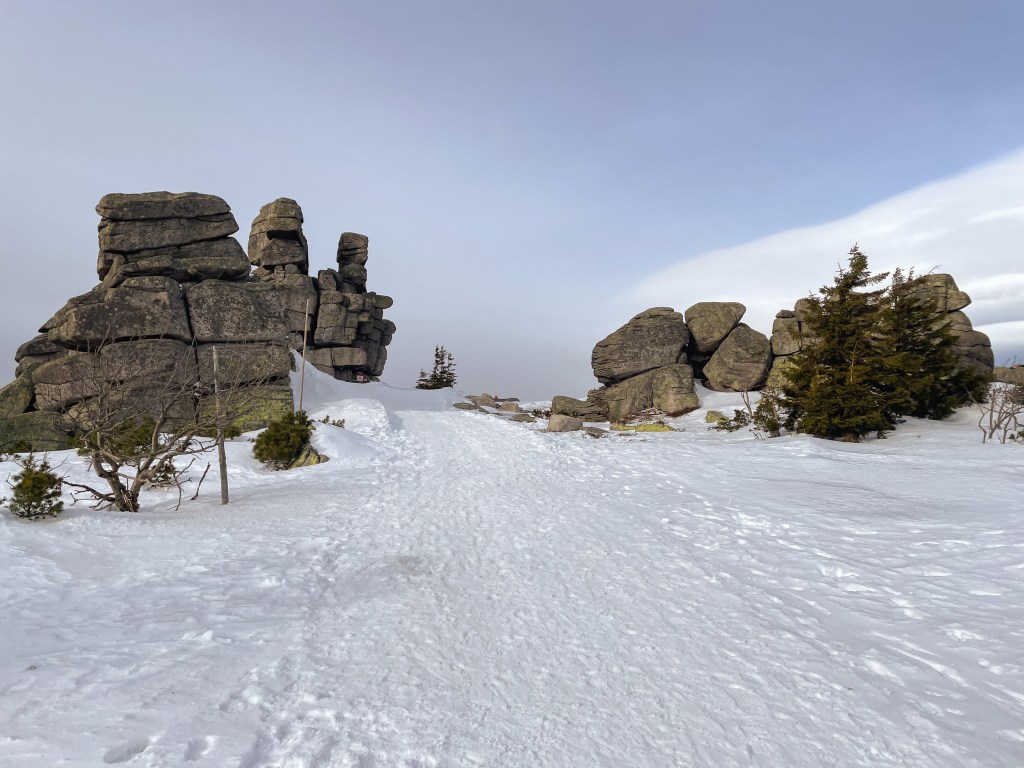 Będąc w okolicy Szrenicy, nie da się przeoczyć świnek. Są ogromne, wręcz monumentalne i… granitowe. Te dochodzące do 8 metrów wysokości formacje skalne wyglądają niczym brama prowadząca do innego świata. Tym lepiej, że aby przejść naszym szlakiem, musimy przez tę bramę przejść.