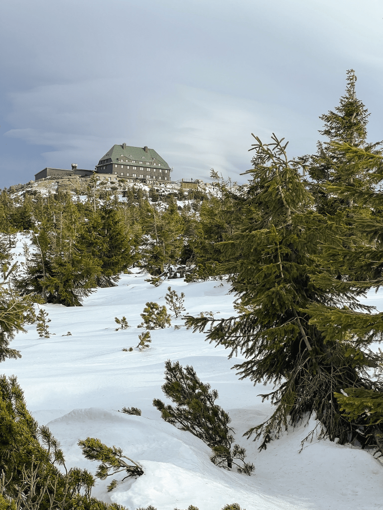 Po przyjemnym odcinku szlaku przez zaśnieżone polany, trafiamy pod Schronisko Szrenica.