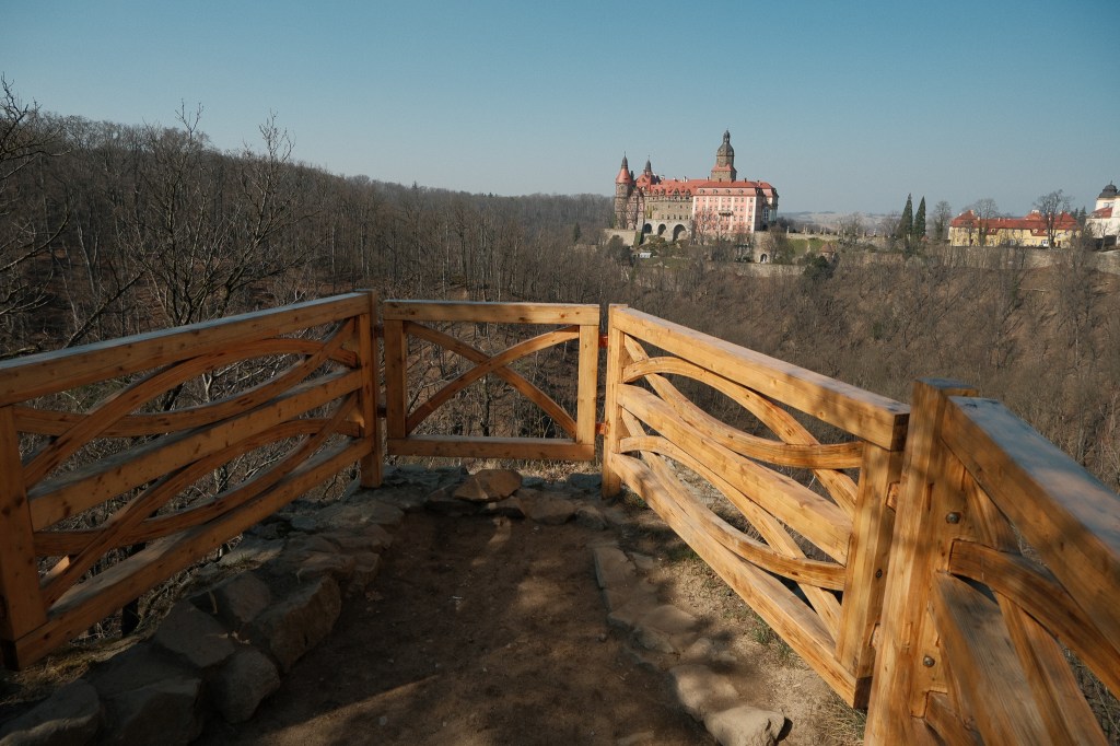 Ten punkt widokowy to obowiązkowy przystanek. Wracam tu za każdym razem, bo to idealne pierwsze spojrzenie na Zamek Książ — z tej perspektywy wygląda jak z pocztówki. Przygotowany taras widokowy zachęca, żeby zrobić krótką przerwę na zdjęcia. Zdjęcia zrobione? Czas na dalszy spacer przez park i kilka minut później znajdujemy się na placu przed bramą wejściową na teren Zamku.
